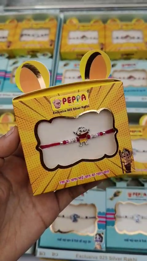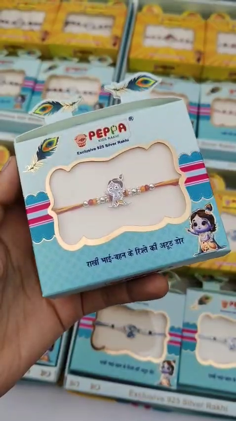 તળાજા વિસ્તારમા આ ૯૨૫ સ્ટર્લિંગ સિલ્વર બેબી રાખી અમારે ત્યાથી એટલે કે ત્રિભોવન વિરજી જવેલર્સમા મળી રહેશે. તેમા બહુ બધી વેરાયટી છે, જેમ કે ક્રીષ્ના રાખી, ડોરેમોન રાખી, એંગ્રી બર્ડસ રાખી, યુનિકોર્ન રાખી, વાઈટ કિટ્ટી અને બીજી ઘણી ટાઈપની રાખી ત્રિભોવન વિરજી જવેલર્સ તળાજા મા ઉપલબ્ધ છે. નાનકડા ભાઈઓ માટે ખાસ બનાવેલ શુદ્ધ ૯૨૫ સ્ટર્લિંગ સિલ્વરની બેબી રાખી (રાખડી). તેને નાજુક ત્વચા માટે સલામત અને આરામદાયક રીતે ડિઝાઇન કરવામાં આવી છે. પ્યારી ડિઝાઇન અને ચાંદીની શુદ્ધતા સાથે, આ બેબી રાખડી એક યાદગાર ભેટ છે.