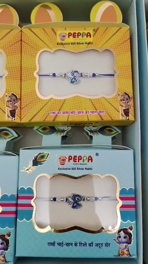 તેમા બહુ બધી વેરાયટી છે, જેમ કે ક્રીષ્ના રાખી, ડોરેમોન રાખી, એંગ્રી બર્ડસ રાખી, યુનિકોર્ન રાખી, વાઈટ કિટ્ટી અને બીજી ઘણી ટાઈપની રાખી ત્રિભોવન વિરજી જવેલર્સ તળાજા મા ઉપલબ્ધ છે.