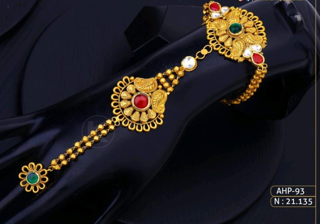 આ ભવ્ય ફ્લોરલ લીફ પેટર્ન ગોલ્ડ પંજા કલાત્મક ડિઝાઇન અને શોખીનો માટે ખાસ છે. અનોખા પાનાંની નક્કાશી અને રંગીન સ્ટોન સાથે આ પંજા એક શાનદાર વૈભવ દર્શાવે છે, જે પરંપરાગત અને આધુનિક દૃષ્ટિકોણનું એક અદભૂત સંયોજન છે.