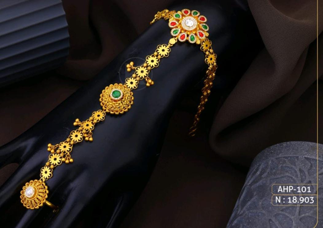 આ મનમોહક ફ્લોરલ મોટિફ ડિઝાઇન ગોલ્ડ પંજા સુંદર ફૂલવટા મોટેિફ અને રંગીન પત્થરો સાથે શણગારાયેલી છે. પ્રાચીન શૈલી અને આધુનિક સ્પર્શનું સંયોજન આ પંજાને ખાસ બનાવે છે. લગ્ન, ઉત્સવ અને શાહી લુક માટે આ એક આકર્ષક પસંદગી છે.