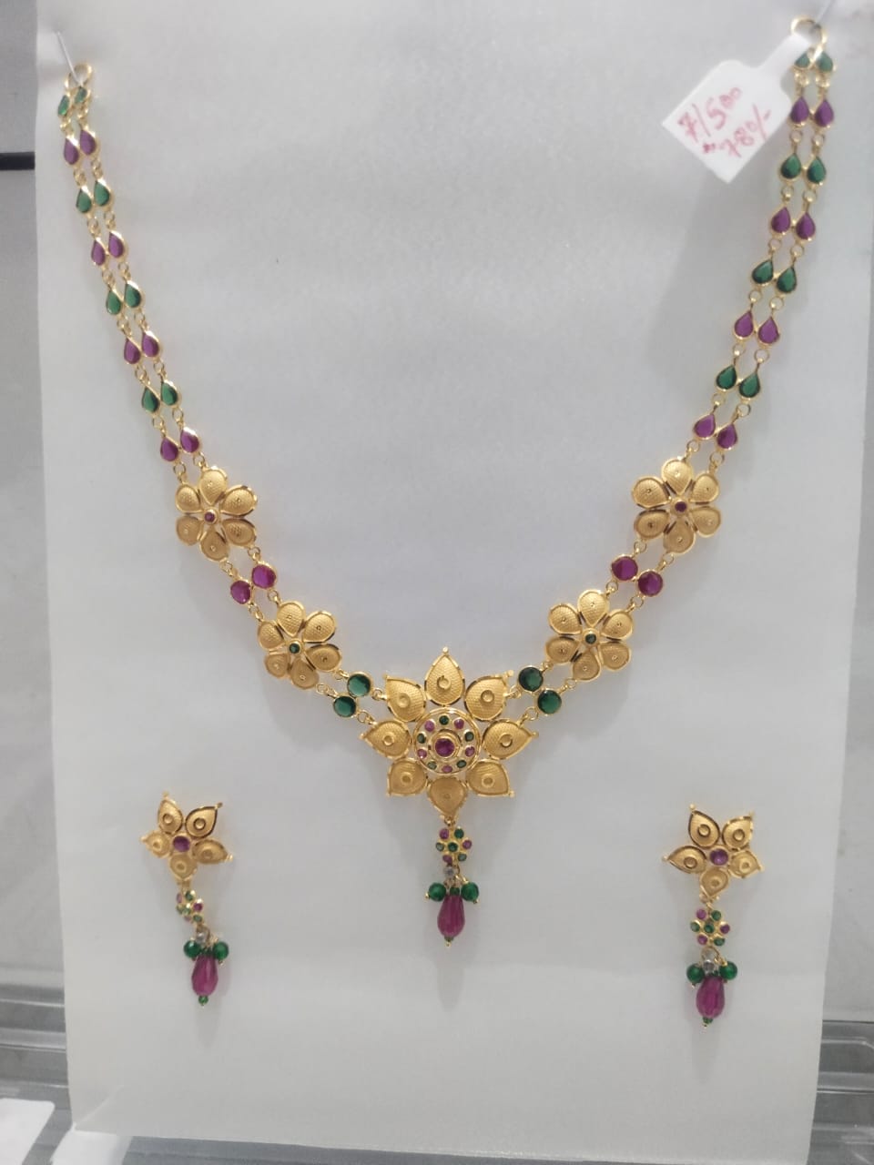 મધ્યમાં મોટી ફૂલાકાર પેન્ડન્ટ સાથે લટકતા રુબી બીડ્સ તેને વધુ રાજવી લુક આપે છે. ઇયરિંગ્સ પણ સેટની ડિઝાઇન સાથે સુસંગત છે, જેમાં નાજુક અને દળદાર કારીગરી દર્શાય છે.