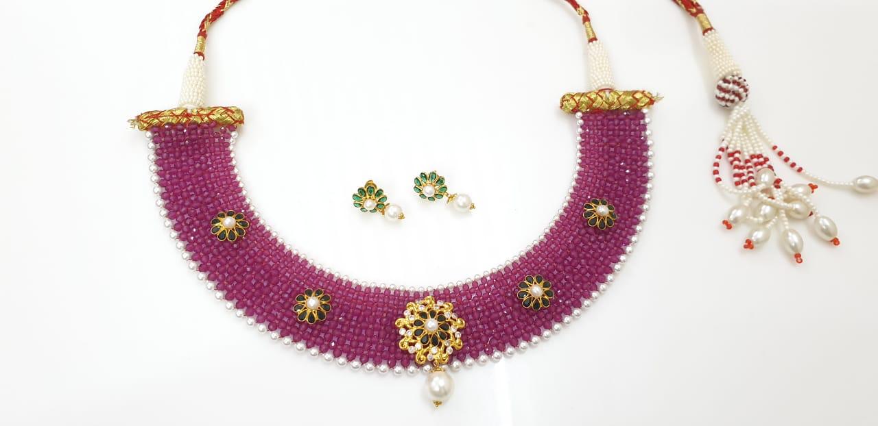 આ સુંદર પર્પલ ઍમરલ્ડ દરબારી સેટ (જામ્બલી) રંગના ઍમરલ્ડ (પન્ના) વડે સજાવટ કરાયેલું છે, જેની આજુબાજુ મોતીની હાર છે. આ સેટ પર સુવર્ણ (ગોલ્ડ પ્લેટેડ) ફૂલોની ડિઝાઈન આપી છે, જે તેને રાજશાહી લુક આપે છે. મધ્યમાં વિશેષ ડિઝાઇનવાળું પેન્ડન્ટ અને એ સાથે મિલતા-જુલતા નાની ઈયરિંગ્સ છે, જે આખા સેટને શોભાયમાન બનાવે છે.